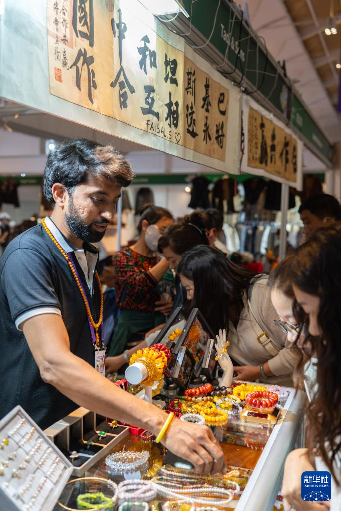 6月24日,參展商在第9屆中國(guó)—南亞博覽會(huì)上售賣飾品。新華社記者 高詠薇 攝