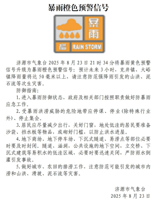 濟(jì)源市氣象臺發(fā)布暴雨橙色預(yù)警信號