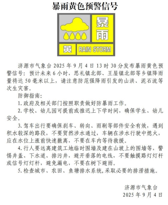 濟(jì)源市氣象臺發(fā)布暴雨黃色預(yù)警信號