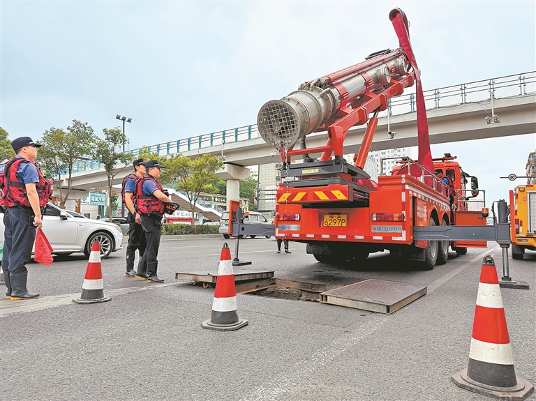 9月10日,鄭州市二七區(qū)城市管理局搶險(xiǎn)人員開(kāi)展汛期風(fēng)險(xiǎn)排查、積水搶排等工作。河南日?qǐng)?bào)社全媒體記者 宋亞猛 攝