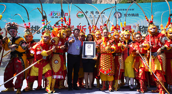 開幕儀式后,六小齡童換上齊天大圣的服裝,與近300名“美猴王”一起在五龍口景區(qū)桃都山挑戰(zhàn)吉尼斯世界紀(jì)錄。他們手持金箍棒,伴隨旋律擺出各種孫悟空經(jīng)典造型。經(jīng)吉尼斯認(rèn)證官現(xiàn)場確認(rèn),最終,他們成功挑戰(zhàn)“最多人裝扮成孫悟空聚會”世界紀(jì)錄。這也讓現(xiàn)場游客直呼“不虛此行”。來自鄭州的游客李女士忍不住感慨道:“今天不僅見到了‘六小齡童爺爺’,還親身見證了世界紀(jì)錄的誕生,這趟旅行非常有意義!”