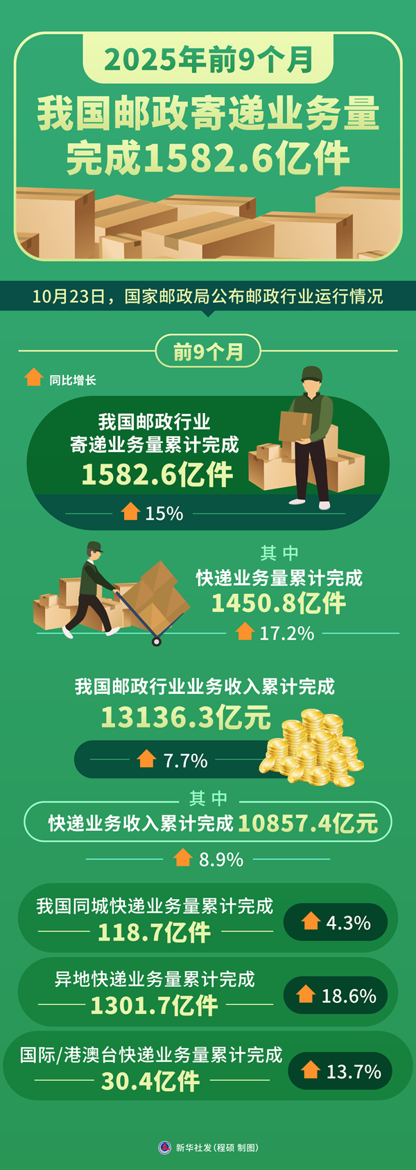 ??新華社北京10月23日電(記者 葉昊鳴)記者23日從國(guó)家郵政局獲悉,前9個(gè)月,我國(guó)郵政行業(yè)寄遞業(yè)務(wù)量累計(jì)完成1582.6億件,同比增長(zhǎng)15%。其中,快遞業(yè)務(wù)量累計(jì)完成1450.8億件,同比增長(zhǎng)17.2%。