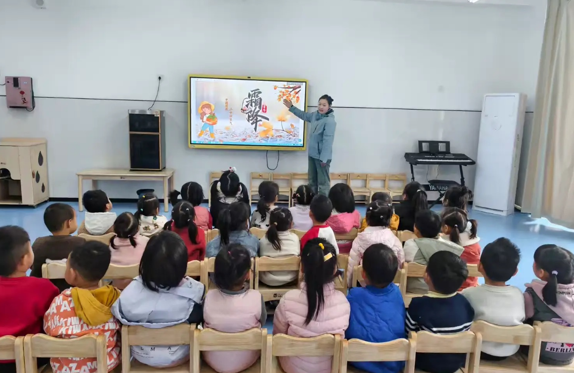 活動伊始,老師們通過集體教學(xué)活動,借助圖片、視頻與生動講解,向孩子們介紹了霜降節(jié)氣的由來、物候特征及相關(guān)民俗,引導(dǎo)他們了解季節(jié)變化對生活的影響,知曉天冷添衣、多喝溫水預(yù)防感冒等健康常識。