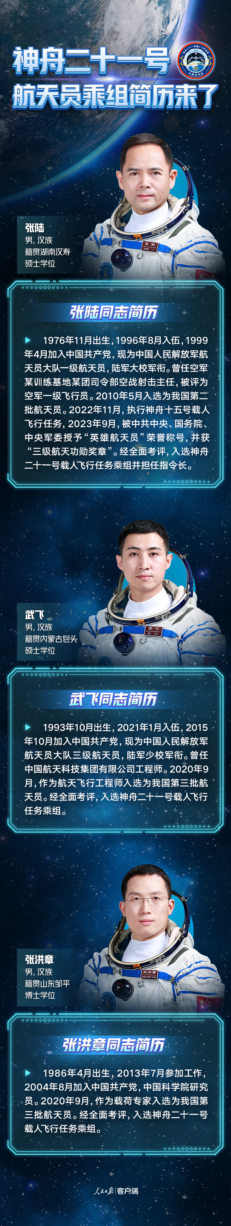 經研究決定,瞄準北京時間10月31日23時44分發(fā)射神舟二十一號載人飛船,飛行乘組由張陸、武飛、張洪章組成,張陸擔任指令長,3名航天員分別為航天駕駛員、飛行工程師和載荷專家,涵蓋了我國現役3種航天員類型。航天員張陸執(zhí)行過神舟十五號載人飛行任務,武飛和張洪章均來自我國第三批航天員,是首次執(zhí)行飛行任務。其中,武飛入選前是中國航天科技集團有限公司空間技術研究院工程師,張洪章入選前是中國科學院大連化學物理研究所研究員。