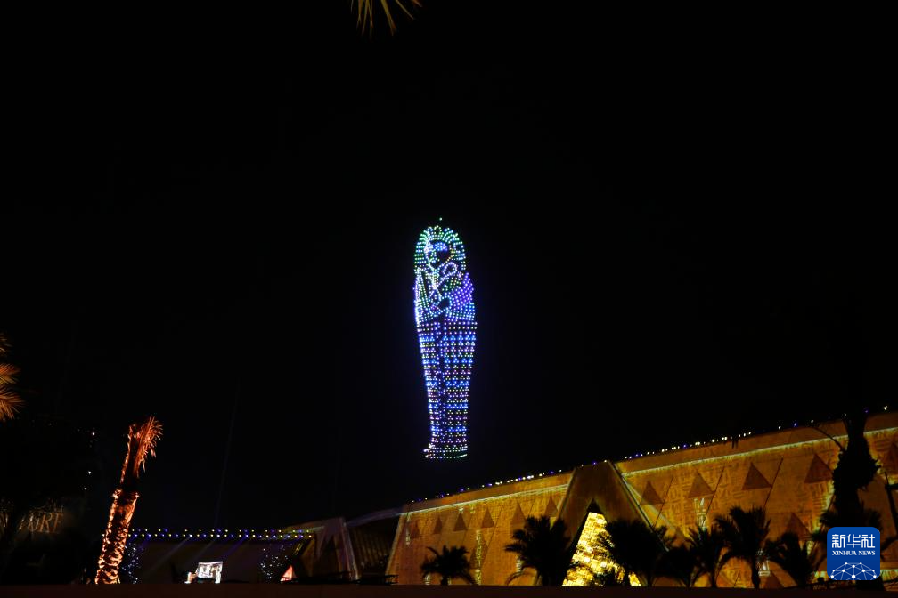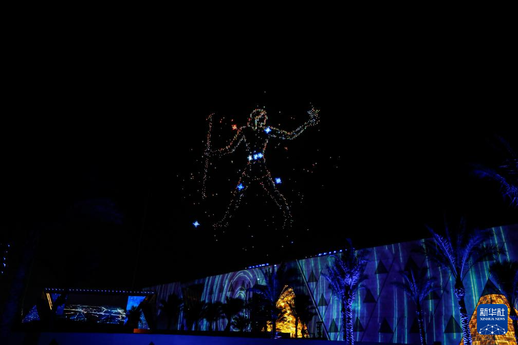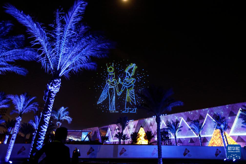 這是11月1日在埃及吉薩拍攝的開館儀式上的無人機表演和燈光秀。