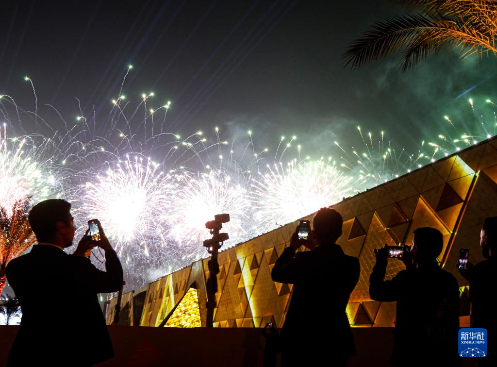 11月1日,人們在埃及吉薩舉行的開館儀式上拍攝煙花和燈光秀表演。