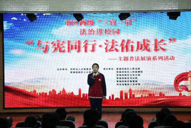在“12?4”國(guó)家憲法日即將到來(lái)之際,鄭州市管城回族區(qū)人民法院聯(lián)合管城區(qū)檢察院、區(qū)公安分局、區(qū)司法局、鄭州市第四十五中學(xué)等多家單位共同開(kāi)展“三官一員”法治進(jìn)校園活動(dòng)。