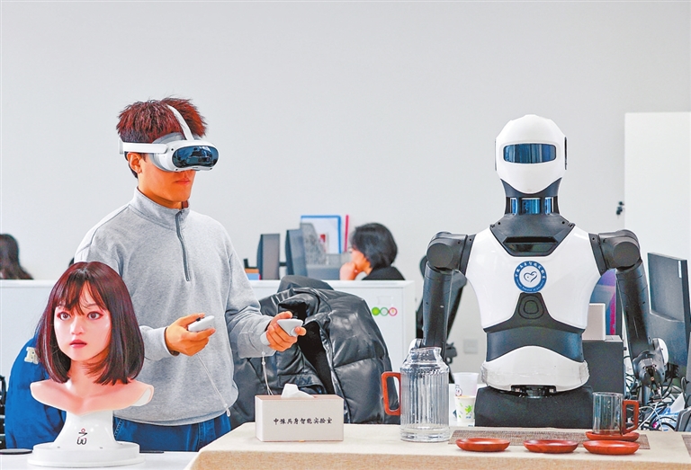 中豫具身智能實驗室研發(fā)的人形機器人在為客人倒水。