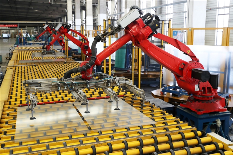 在位于襄城縣的許昌安彩新能科技有限公司,工業(yè)機(jī)器人在生產(chǎn)線上精細(xì)作業(yè)。 牛書培 攝