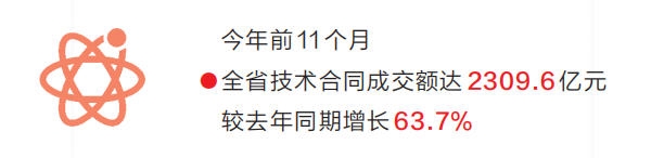 2025年,我省創(chuàng)新能力在全國(guó)排名攀升至第12位,創(chuàng)下歷史最好成績(jī)。省科技廳最新數(shù)據(jù)表明,截至11月底,全省技術(shù)合同成交額達(dá)2309.6億元,較去年同期增長(zhǎng)63.7%。