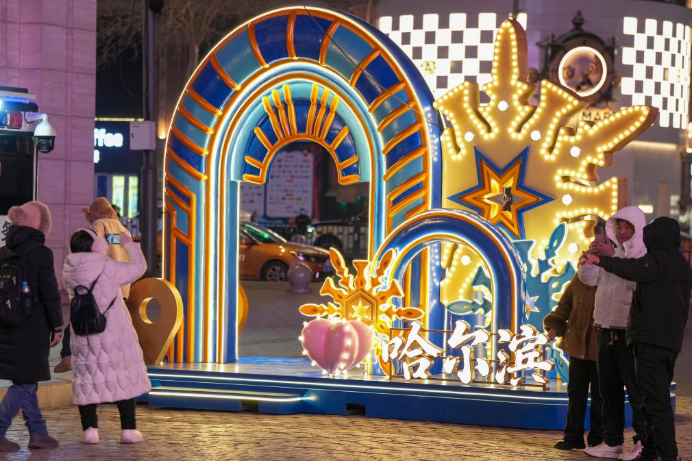 人們?cè)诠枮I市中央大街上的一處景觀前拍照(2025年12月16日攝)。新華社記者 王松 攝