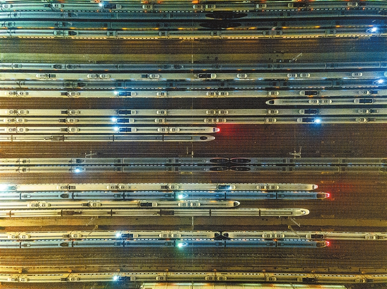 2月1日凌晨,中國鐵路鄭州局集團有限公司鄭州動車段停車場內,一列列完成當日運營任務的動車組陸續(xù)返回。