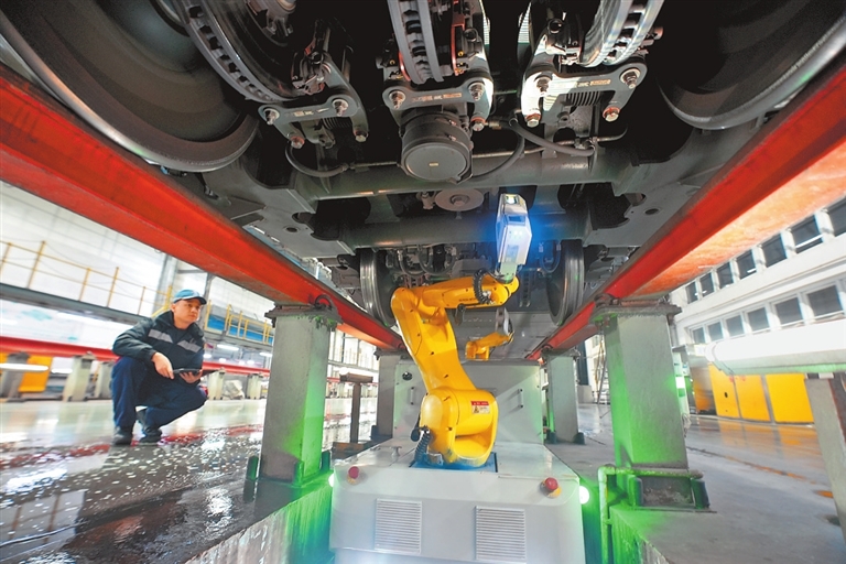 走進動車段檢修庫,只見最新型復興號和以往常見的和諧號等各類動車組正有序接受檢修。一臺智能機器人在車底靈活穿梭,自動檢查底盤關鍵部件;一旁的工作人員通過電腦精準操控機械臂,實現(xiàn)人機協(xié)同作業(yè)。智能化檢修為高鐵安全運維增添科技保障。