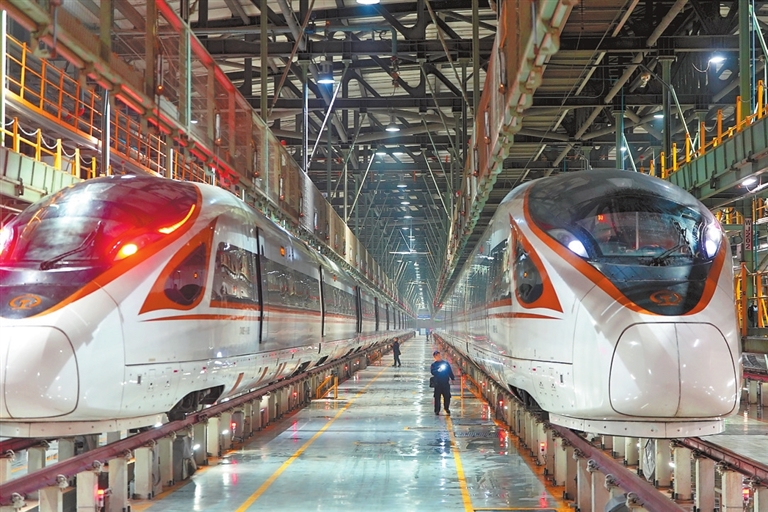 在這里,它們經(jīng)過全面清洗、細致檢修,隨后整齊停入指定位置,準備投入次日繁忙的春運旅途。