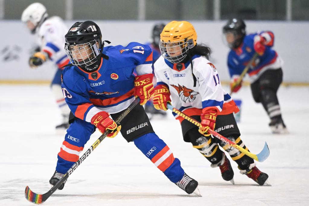 ??1月25日,在齊齊哈爾市的黑龍?bào)w育館內(nèi),二馬路小學(xué)翼虎冰球隊(duì)隊(duì)員劉金梓晨(左)在訓(xùn)練中。新華社記者 張濤 攝