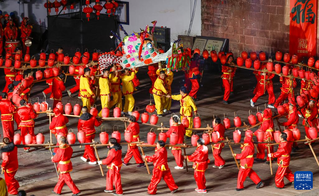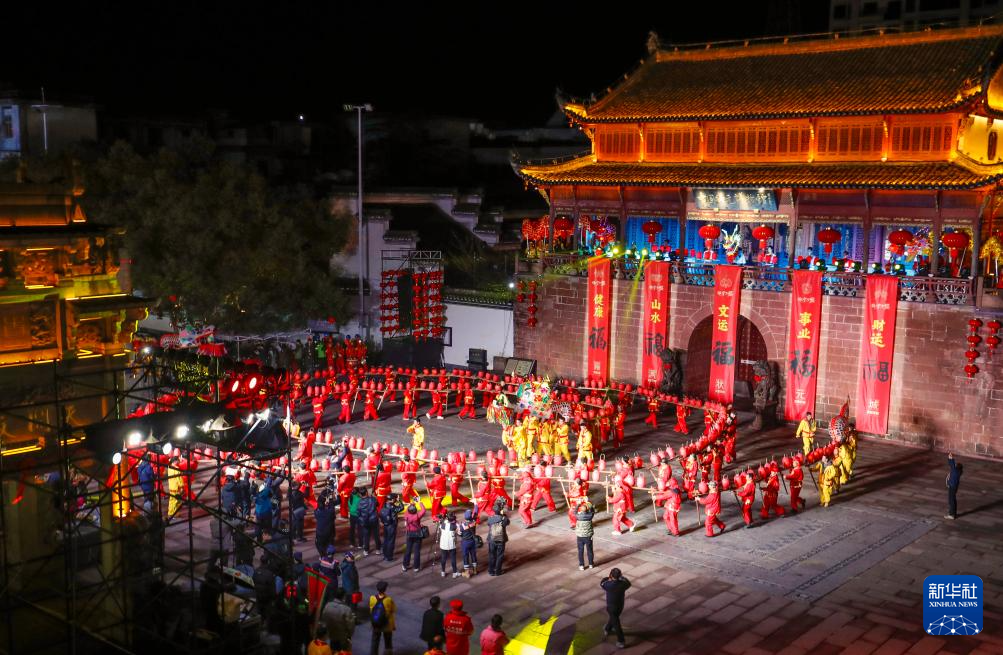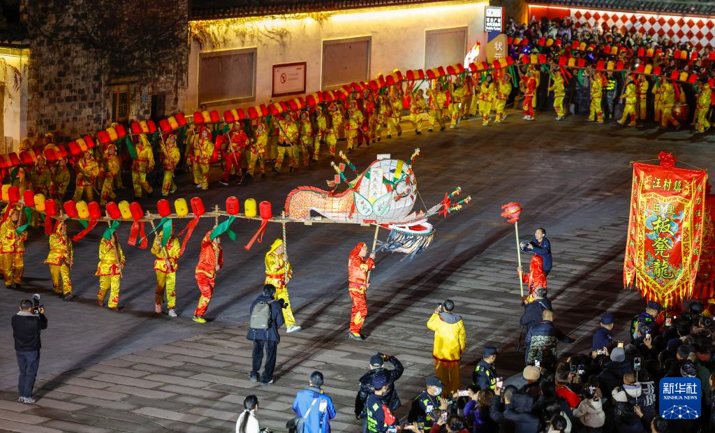 2月28日,在安徽省黃山市休寧縣狀元廣場(chǎng),非遺民俗徽州板凳龍?jiān)谝股醒灿巍?/span>