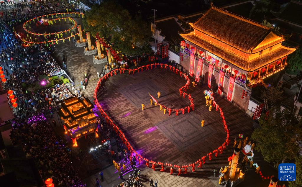 ??農(nóng)歷正月十二,安徽省黃山市休寧縣“福滿狀元城”舞龍大會(huì)在狀元廣場(chǎng)熱鬧開(kāi)演。百米長(zhǎng)的非遺民俗徽州板凳龍?jiān)诮窒镩g穿梭游動(dòng),與鐘鼓樓相映成輝,喜迎元宵佳節(jié)。新華社發(fā)(施亞磊攝)