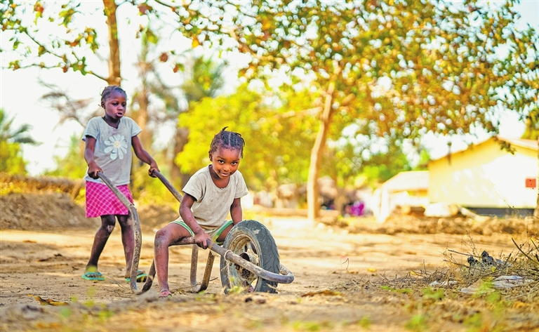 2026年1月18日,幾內(nèi)亞博凱地區(qū),小朋友在當(dāng)?shù)匦陆ǖ姆孔忧巴嫠#袊髽I(yè)的到來改善了當(dāng)?shù)厝藗兊纳??!”緢?bào)全媒體記者 王亞鴿 崔超 攝