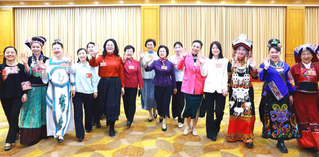 ??圖為貴州代表團(tuán)的女代表們?cè)谝黄稹?受訪者供圖)