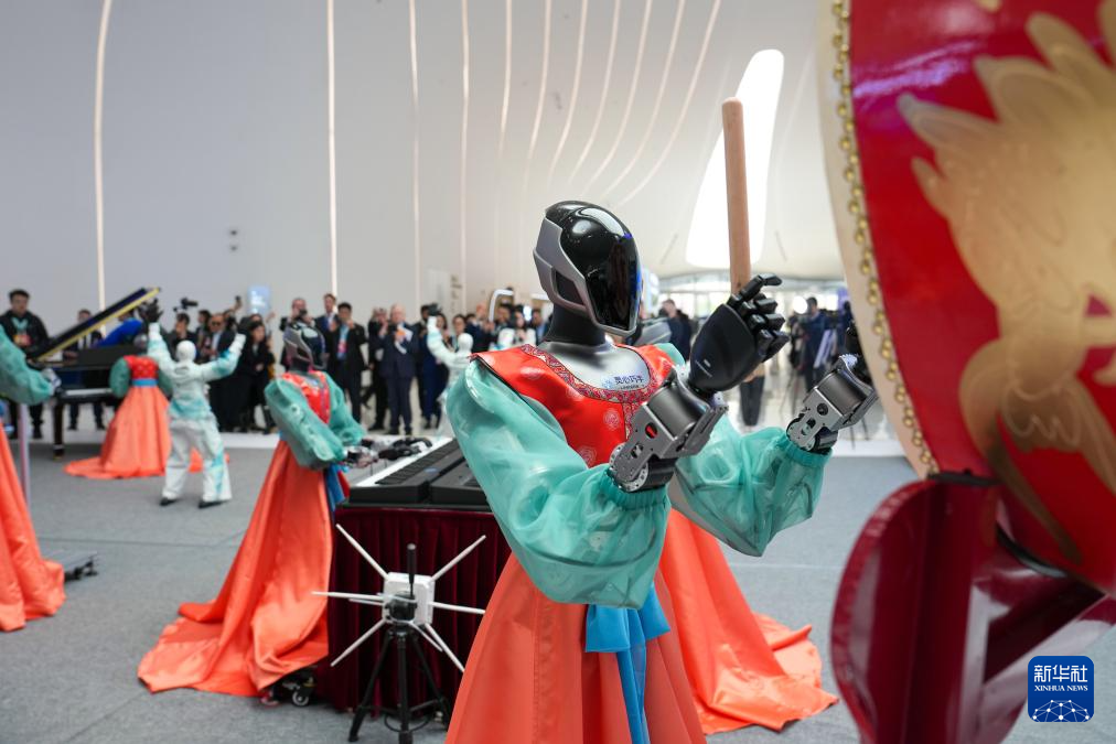 3月25日,在中關(guān)村國際創(chuàng)新中心,機(jī)器人在演奏樂器,表演舞蹈。