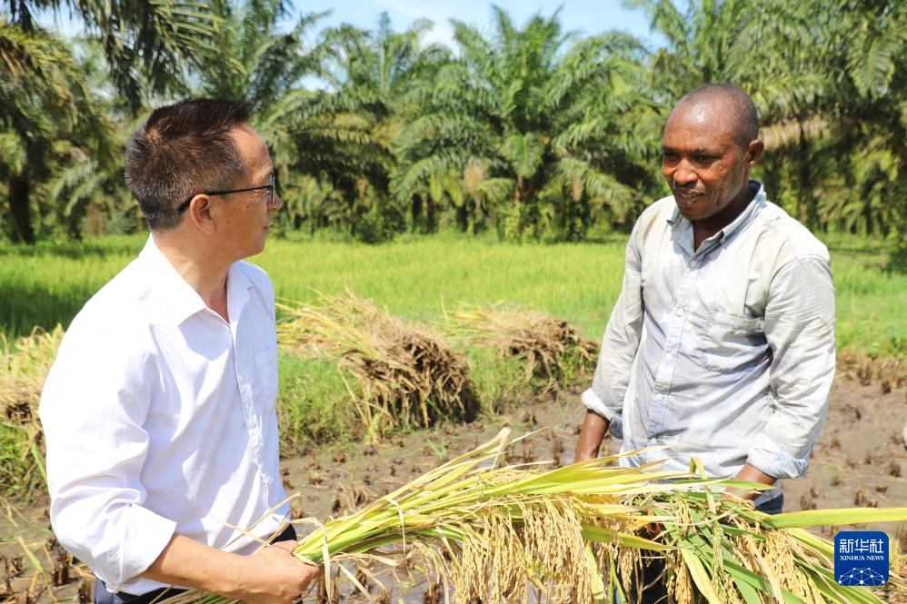 3月25日,在布隆迪布瓊布拉省姆潘達(dá)縣,中國(guó)援布農(nóng)業(yè)專家組組長(zhǎng)楊華德(左)和當(dāng)?shù)剞r(nóng)業(yè)技術(shù)員麥樂斯交流水稻收獲情況。