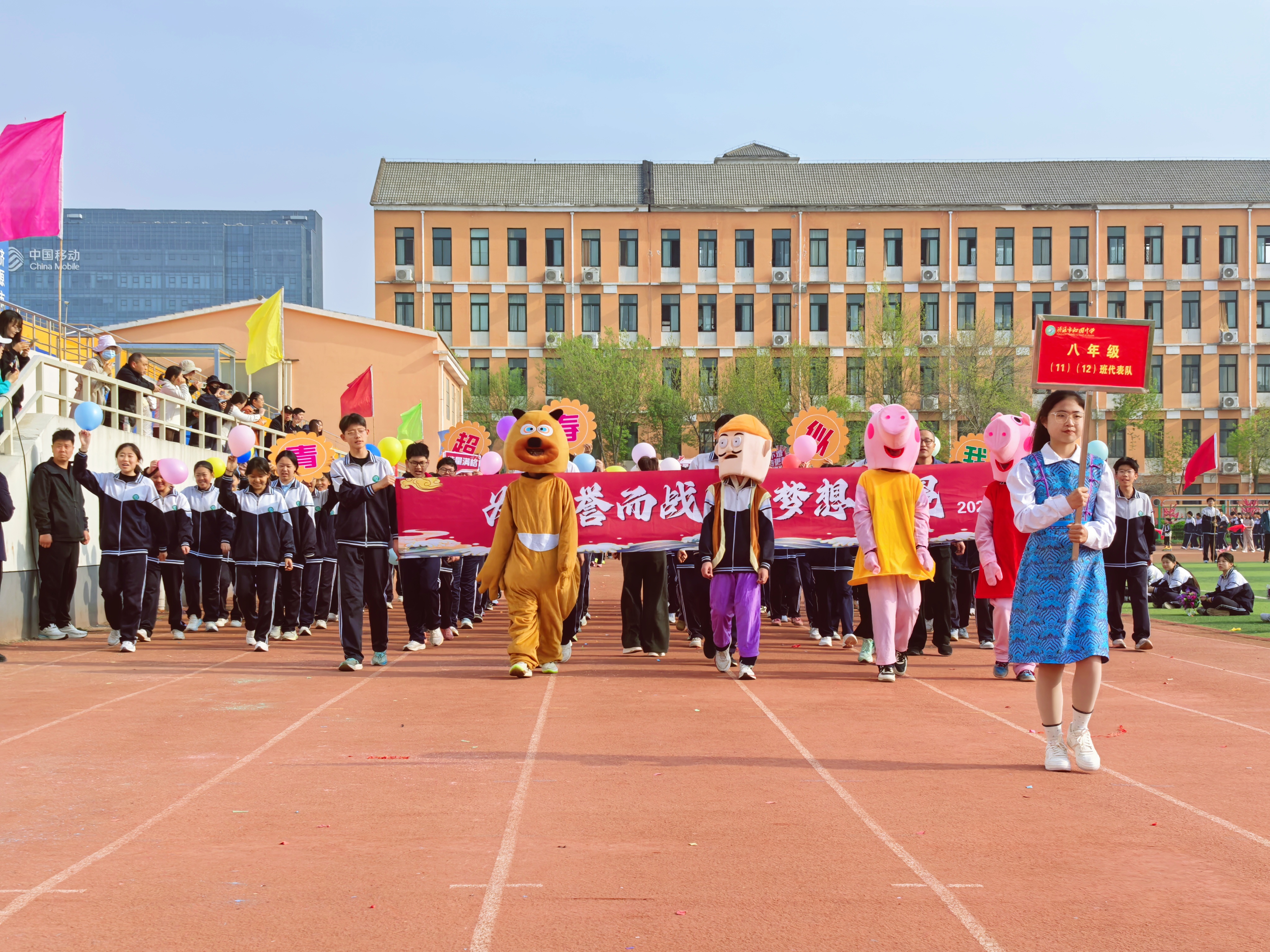 上午8時(shí),激昂的《運(yùn)動(dòng)員進(jìn)行曲》準(zhǔn)時(shí)奏響,開幕式正式拉開帷幕。國(guó)旗隊(duì)、五環(huán)旗隊(duì)、校旗隊(duì)邁著鏗鏘堅(jiān)定的步伐率先入場(chǎng),彰顯著沁中學(xué)子的家國(guó)情懷;“敢為人先追求卓越”“運(yùn)動(dòng)青春沁德潤(rùn)智”的八字標(biāo)語(yǔ)醒目有力,傳遞著學(xué)校的育人追求;色彩斑斕的彩旗方陣、花束隊(duì)交相輝映,為賽場(chǎng)增添了盎然生機(jī)。隨后,七、八年級(jí)各26個(gè)班級(jí)代表隊(duì)依次創(chuàng)意亮相:各班方陣獨(dú)具巧思、精彩紛呈,有的以紅綢鋪展成五星紅旗,赤誠(chéng)之心躍然場(chǎng)上;有的高舉紅旗從少年頭頂掠過(guò),生動(dòng)詮釋 “生在國(guó)旗下,長(zhǎng)在春風(fēng)里” 的時(shí)代榮光;有的將籃球、足球、羽毛球、跳繩、拔河等體育項(xiàng)目融入展演,盡顯健康向上、活力四射的青春風(fēng)采;還有的精心制作班主任海報(bào)與勵(lì)志橫幅,在歡聲笑語(yǔ)中展現(xiàn)出師生同心、攜手奮進(jìn)的深厚情誼。