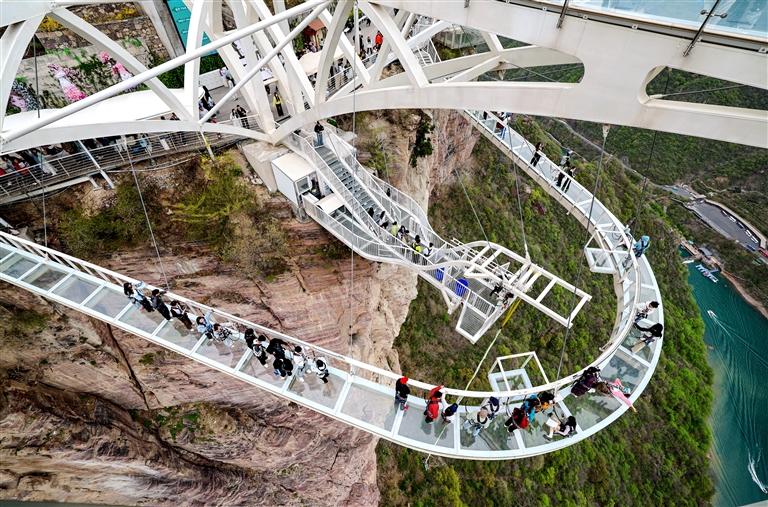 4月5日,游客在寶泉景區(qū)體驗(yàn)懸崖峭壁之上的玻璃棧道,感受高空行走的“云端心跳”。本文配圖均為本報(bào)全媒體記者 鄧放 攝