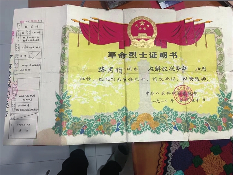 路向軍把爺爺?shù)拿?、籍貫、參軍時(shí)間一一告知。李女士認(rèn)真核對(duì)信息,經(jīng)多方查證,最終確認(rèn):路黑鎖烈士犧牲于1948年淮海戰(zhàn)役,葬在安徽濉溪縣雙堆集烈士陵園。