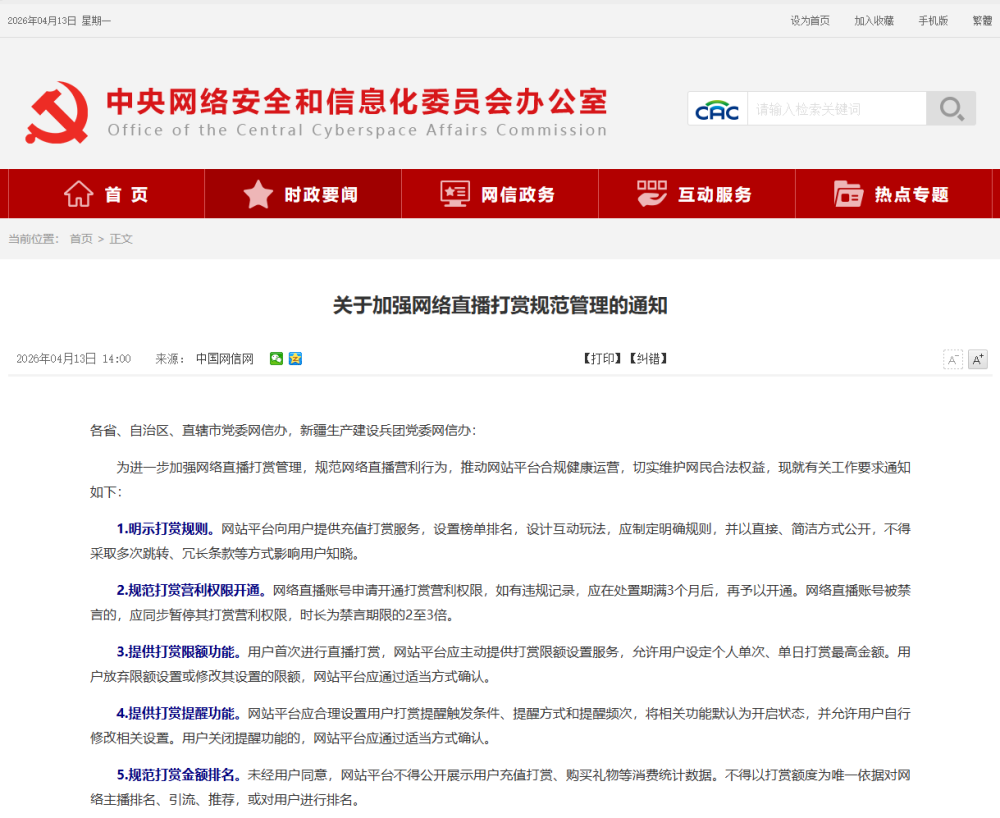 ?中央網(wǎng)信辦發(fā)布《關(guān)于加強(qiáng)網(wǎng)絡(luò)直播打賞規(guī)范管理的通知》
