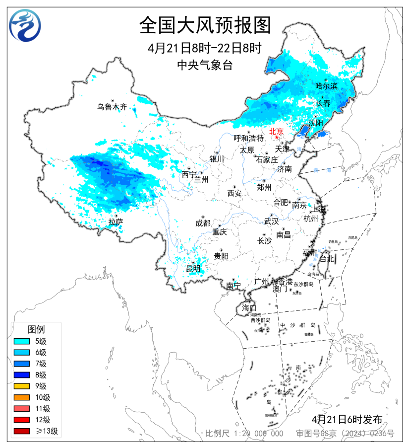預(yù)計,4月21日8時至22日8時,內(nèi)蒙古中東部、黑龍江中南部、吉林、遼寧以及新疆南疆盆地、西藏北部、青海西部等地部分地區(qū)有5~7級風,陣風8~9級,渤海北部海域、黃海北部海域?qū)⒂?級、陣風8級的風。