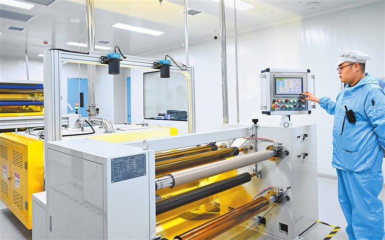 智能化生產線上,薄如蟬翼的聚酰亞胺(PI)薄膜在機器上雙向精準拉伸而成。辰龍化工負責人李學彬介紹,這種薄膜有“黃金膜”之稱,廣泛應用于航空航天、電子通信、汽車制造、柔性顯示、高速軌道交通等領域,是戰(zhàn)略性新材料“金字塔尖”的材料。